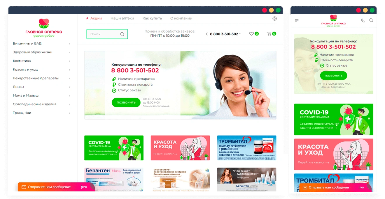 У компании раньше не было своего сайта, поэтому продажа велась только через стационарную аптечную сеть. Заказчик принял решение расширить географию продаж и аудиторию клиентов, создать представительство аптеки в сети интернет. В наши задачи входило создать сайт, наполнить каталог товарами из 1С и тщательно проработать оформление, соединить склады аптек с онлайн складами.